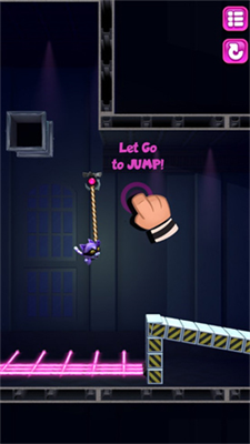 1、创新竖屏操作系统:单手即可完成所有操作,通过长按控制蓄力角度,松手释放绳索实现精准摆荡,独特的操作逻辑让游戏兼具策略性与爽快感。