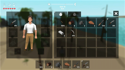 游戏初始阶段需优先建立临时庇护所,建议选择靠近淡水资源区域搭建基础营地。通过砍伐树木获取原木制作工具台,逐步解锁石斧、渔网等生存工具的制作配方。注意观察左上角三维状态栏,实时监控体温、饥饿与疲劳值的变化。