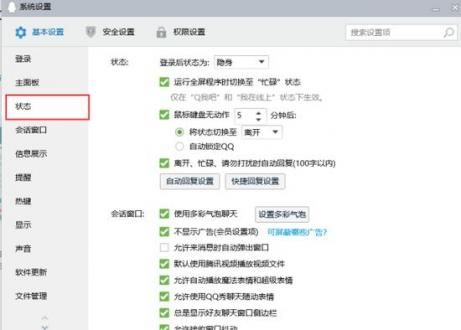 3、进入基础设置面板后,在左侧导航栏选择「状态」分类。该模块集中管理在线状态显示规则,包含隐身、离开、忙碌等状态的行为设置。