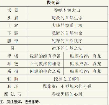 该配置侧重范围清图能力,自然生命套装(头肩/下装)与循环之鞋形成移动施法循环。绿野手镯配合真龙三贴膜提升技能范围,吞噬黑暗心脏与战术信号弹耳环强化AOE爆发。挖掘之王部件提供额外资源获取,适合需要快速清理副本的作战场景。