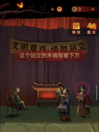 将纸钱投入火堆触发树木开花现象,根据花瓣颜色规律调整戏台面具方位,使用铁钩固定机关后取得牌位道具。将牌位归位后获得观测道具,通过望远镜观察戏台机关,正确放置葫芦道具可获取木剑等重要解谜工具。