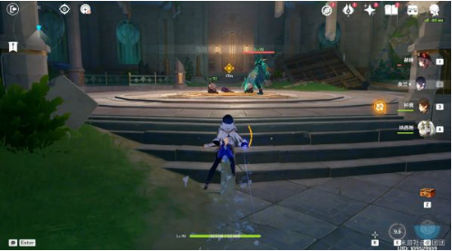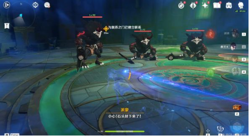 4、继续推进主线至三岔路口时,选择右侧通道进入圆形大厅。建议使用聚怪角色快速清理三只雷箭丘丘人,注意规避场地中央的持续落雷区域。