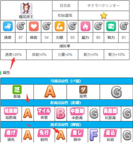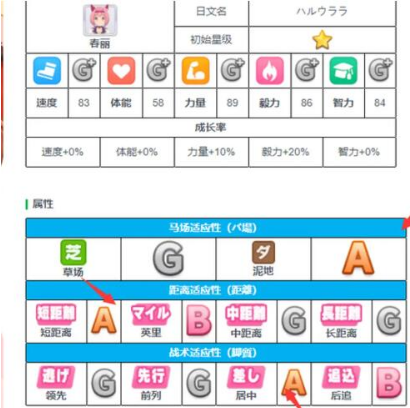 速度成长评级达到S级,适合短距离竞速赛事。建议前期集中提升力量属性突破加速度阈值,中期通过智力训练提高专属技能「樱花冲刺」的触发频率。