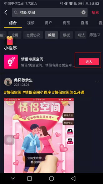 1、启动抖音应用并定位搜索栏,输入关键词【情侣空间】,在搜索结果中点击对应功能的【立即体验】入口
